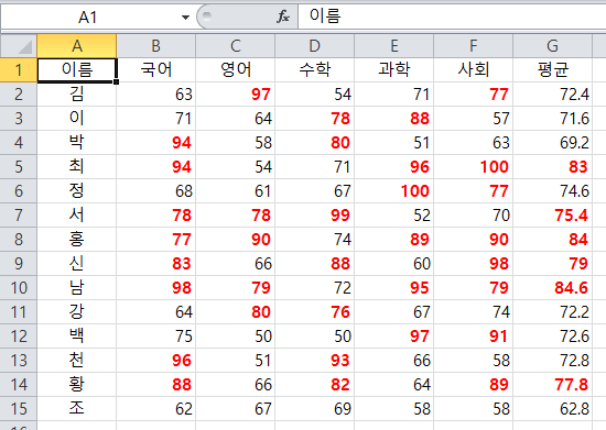 지난 글 https://nationwide.tistory.com/29 https://nationwide.tistory.com/30 RANDBETWEEN, AVERAGE 함수로 만든 데이터를 이용해 조건부 서식에 대해 설명하도록 한다. 위와 같은 학생 성적 데이터가 있을 때..